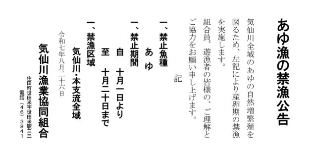 令和7年度のアユ漁の禁漁期間は